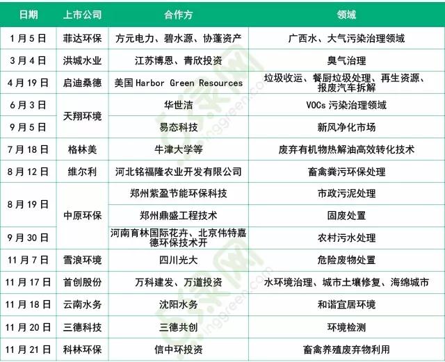 據(jù)點(diǎn)綠網(wǎng)統(tǒng)計(jì),2017年以來(lái)截至11月21日,多家環(huán)保企業(yè)設(shè)立合資公司拓展新業(yè)務(wù)。據(jù)悉,12家企業(yè)設(shè)立的合資公司業(yè)務(wù)集中臭氣治理、新風(fēng)凈化市場(chǎng)、畜禽養(yǎng)殖廢物治理等具體的細(xì)分領(lǐng)域。具體是哪些企業(yè),又是那些領(lǐng)域,讓我們先睹為快。